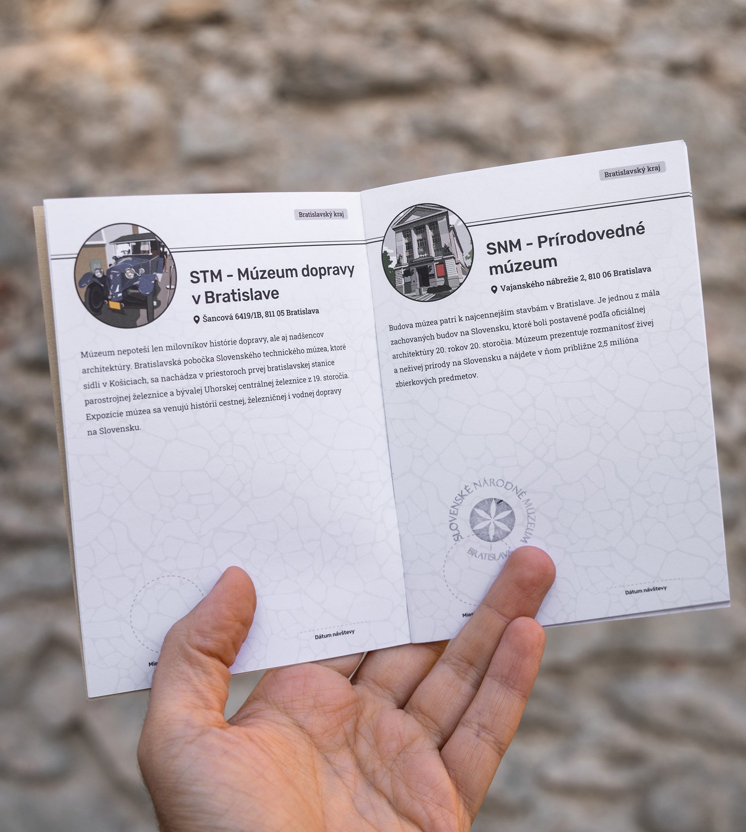 Každá stránka Múzejného pasu vás vtiahne do iného príbehu. Spojte ich všetky dokopy a vytvorte si svoju vlastnú zbierku príbehov (a pečiatok), ktoré dlhé stáročia formovali Slovensko. Pre tých najodvážnejších sme v závere Múzejného pasu pripravili zoznam všetkých 160 múzeí a skanzenov, ktoré evidujeme na území Slovenska.