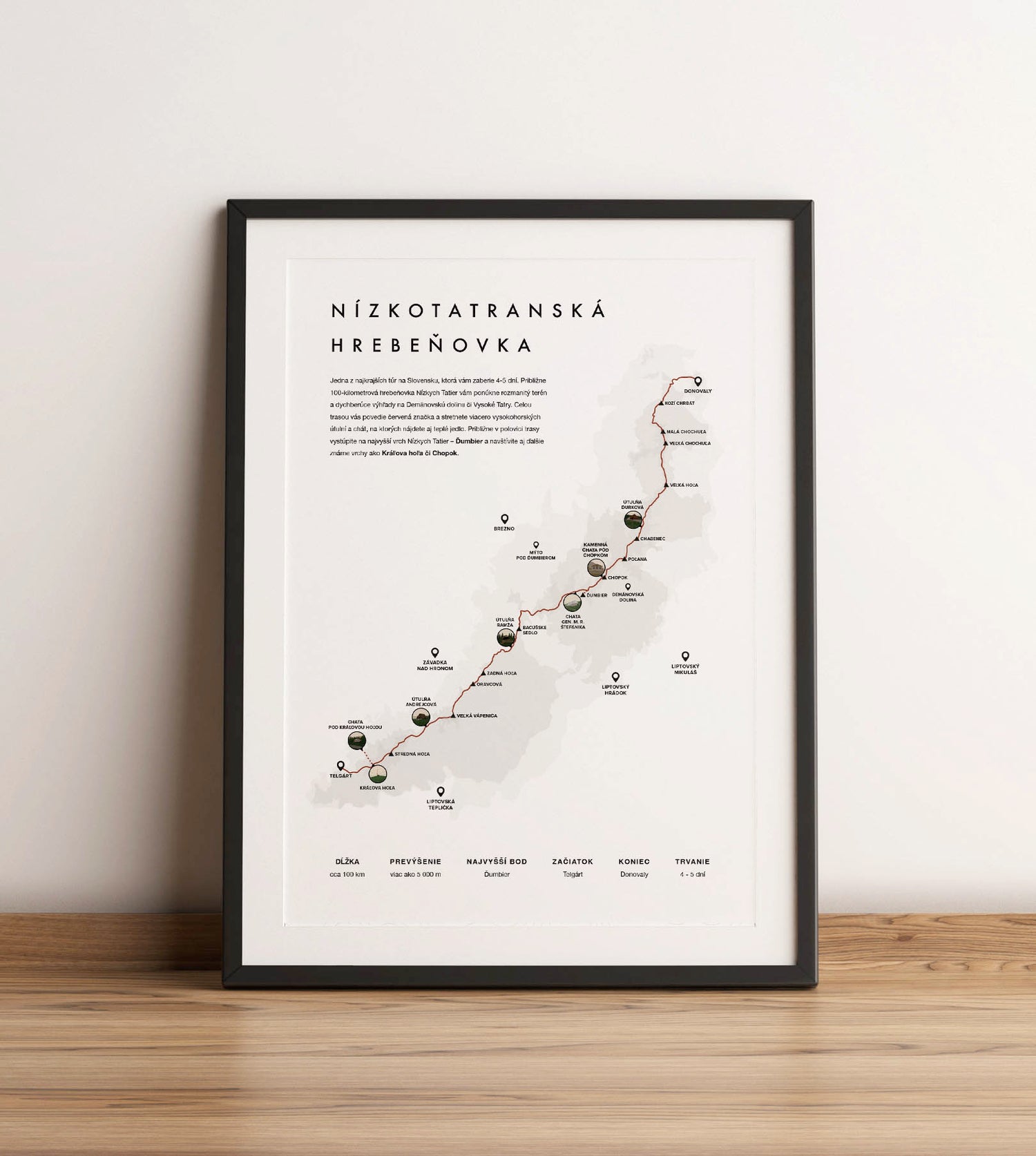 Plagát tvorí originálna ilustrácia slovenských autorov, zobrazujúca autentickú mapu turistickej trasy vyznačenú niekoľkými významnými bodmi. V spodnej časti je uvedený názov trasy a hŕstka základných informácií o priebehu turistickej magistrály. Plagát Nízkotatranská hrebeňovka je vytlačený na 250 g ekologickom papieri Favini Crush Corn s certifikátom FSC, bez GMO, ktorý obsahuje až 40 % recyklovaného odpadu.