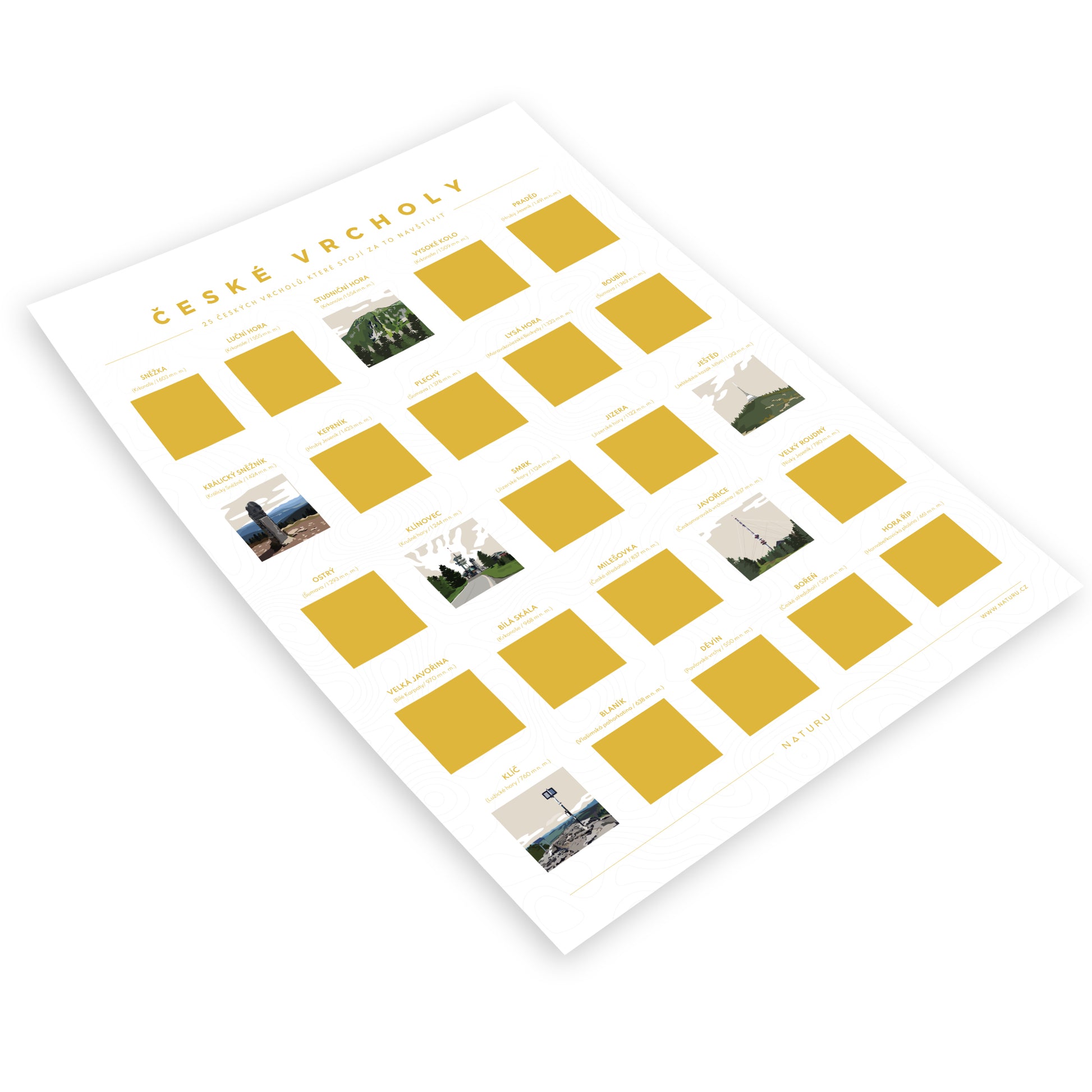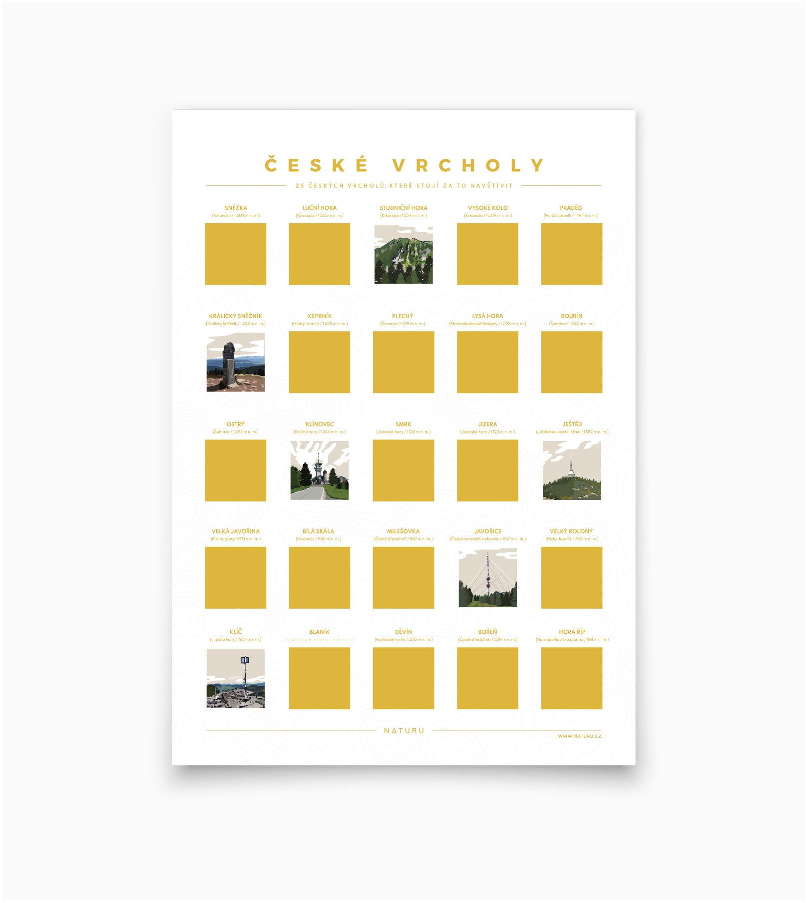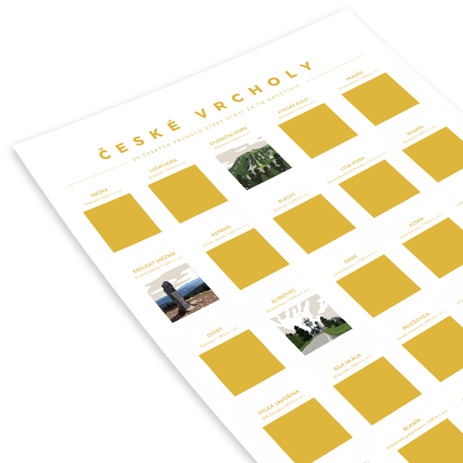 So stieracím plagátom České vrcholy budete mať o nápady na výlety po Česku postarané. Pod 25 stieracími políčkami nájdete nádherné ilustrácie najkrajších českých pohorí, ako sú Krkonoše, Jeseníky, Jizerské hory či Orlické hory. Každé z týchto pohorí ukrýva jedinečné miesta, ktoré stoja za návštevu. Zotrite stieracie políčko po každom výlete a uchovajte si spomienku na ďalšie zdolané ciele. Tento originálny plagát je nielen krásnou dekoráciou, ale aj skvelou motiváciou na spoznávanie prírodných krás českej krajiny.