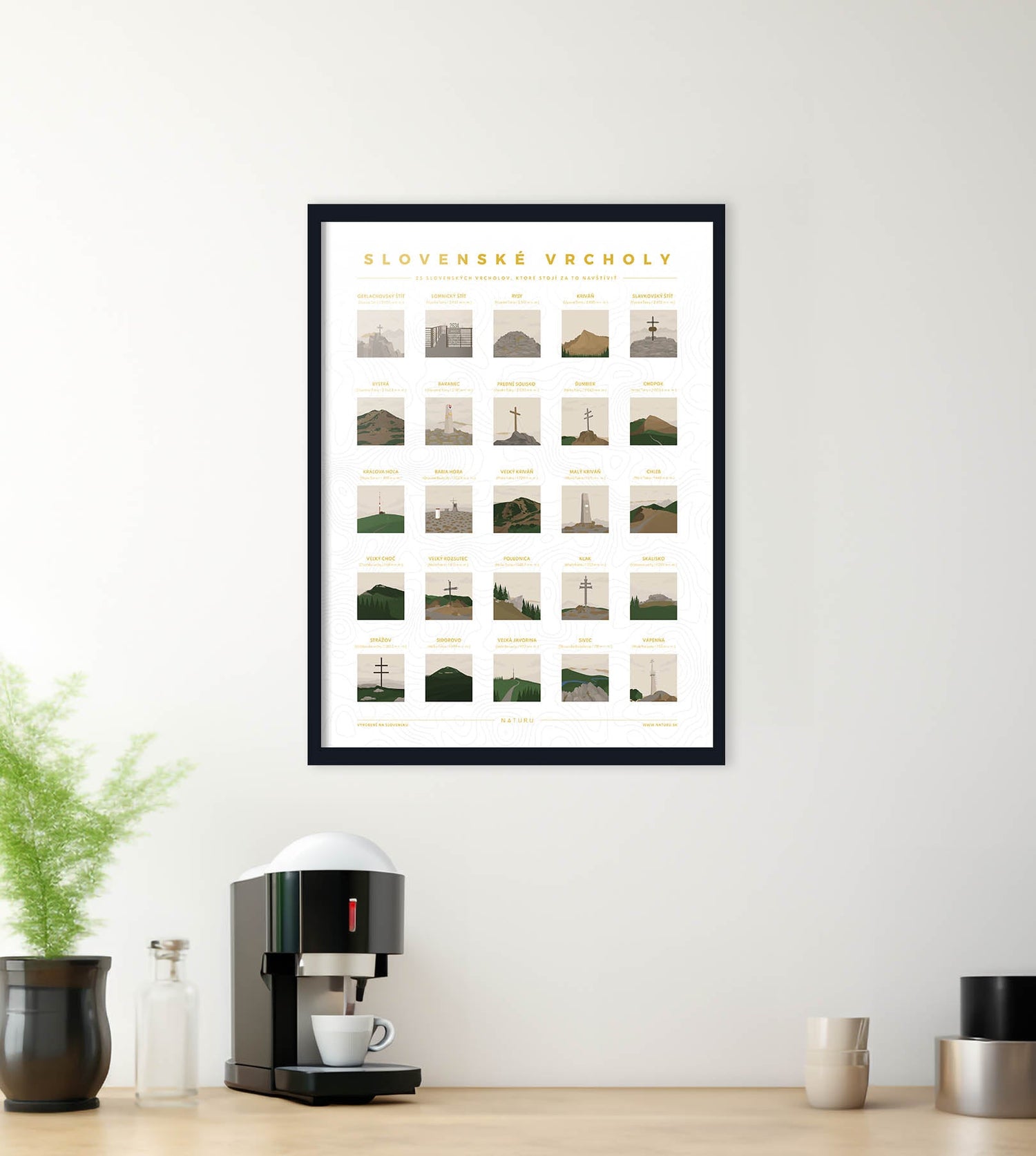 So stieracím plagátom Slovenské vrcholy budete mať o nápady na výlety po Slovensku postarané. Pod 25 stieracími políčkami vás čakajú neprehliadnuteľné ilustrácie tých najznámejších a najvyhľadávanejších slovenských vrcholov. Vysoké Tatry, Nízke Tatry, či Malá a Veľká Fatra. To je len časť pohorí, ktorých vrcholy sme ukryli na tomto originálnom stieracom plagáte. Navštívte jednotlivé miesta na plagáte a svoju návštevu zaznamenajte zotretím stieracieho políčka – na spomienku či oslavu ďalšieho zdolaného miesta.