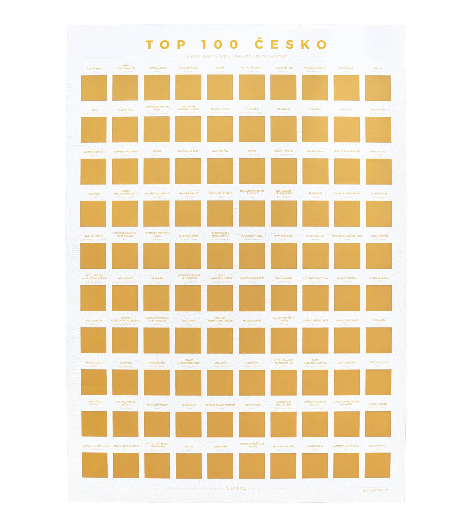 Stierací plagát TOP 100 Česko podnecuje a motivuje k objavovaniu krás Česka. Prostredníctvom stovky originálnych ilustrácií predstavuje miesta, ktoré sa oplatí navštíviť, a výlety, ktoré stojí za to podniknúť. Tento stierací plagát vo formáte A2 je vhodný ako milý darček aj ako interiérová dekorácia každého vášnivého turistu. Poslúži tiež ako inšpiratívny bucket list TOP 100 miest v Česku. Svoje cestovateľské zážitky oslávite zotretím príslušnej zlatej plochy, ktorá odhalí farebnú ilustráciu. Nechajte sa inšpirovať jedinečným plagátom, stierajte políčka a navštívte tie najkrajšie miesta v Česku.