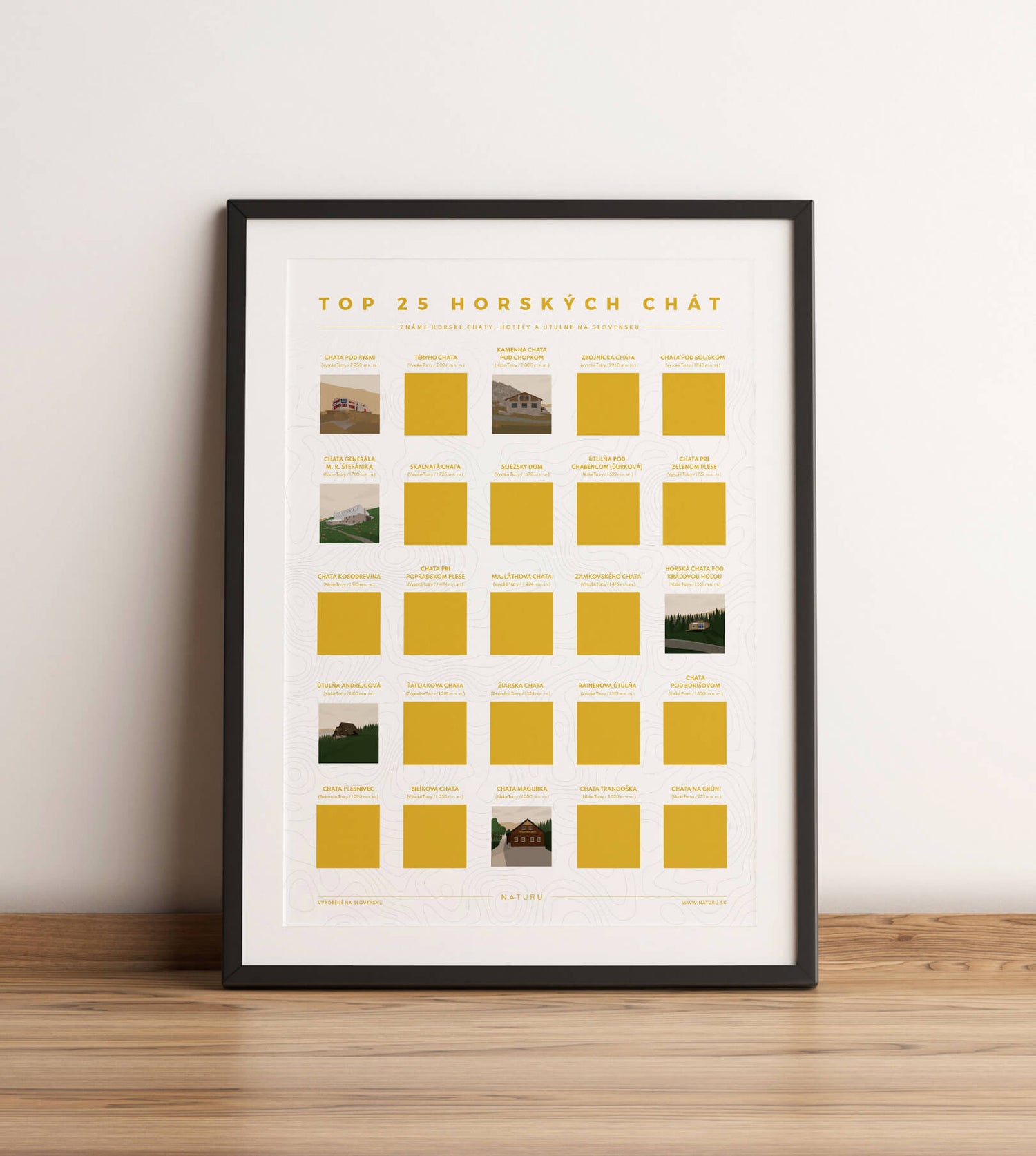 So stieracím plagátom TOP 25 horských chát budete mať o nápady na výlety v slovenských horách postarané. Pod 25 stieracími políčkami vás čakajú moderné ilustrácie najznámejších horských chát na Slovensku vo Vysokých, Nízkych, Belianskych a Západných Tatrách a Veľkej aj Malej Fatre. K jednotlivým chatám, hotelom a útulniam vás dovedú turistické chodníčky, ktoré sa postarajú o neopakovateľný zážitok a pobyt v slovenskej prírode. A kto sa na takýto výlet vydá a úspešne zdolá jednotlivé chaty, môže svoj úspech zaznamenať zotretím stieracieho políčka – na spomienku či oslavu ďalšieho zdolaného miesta.