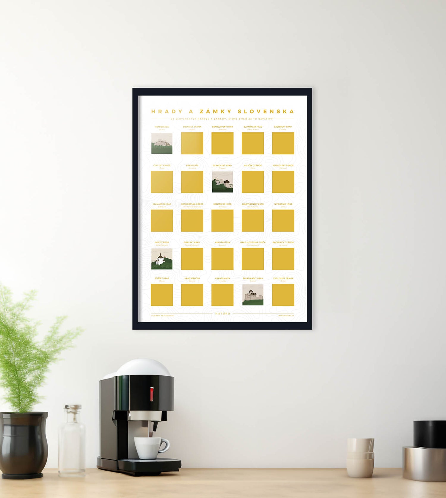 So stieracím plagátom TOP 25 slovenských hradov a zámkov budete mať o nápady na výlety po Slovensku postarané. Pod 25 stieracími políčkami vás čakajú moderné ilustrácie famóznych slovenských hradov a zámkov. Navštívte jednotlivé miesta na stieracom plagáte a svoju návštevu zaznamenajte zotretím stieracieho políčka – na spomienku či oslavu ďalšieho zdolaného miesta.